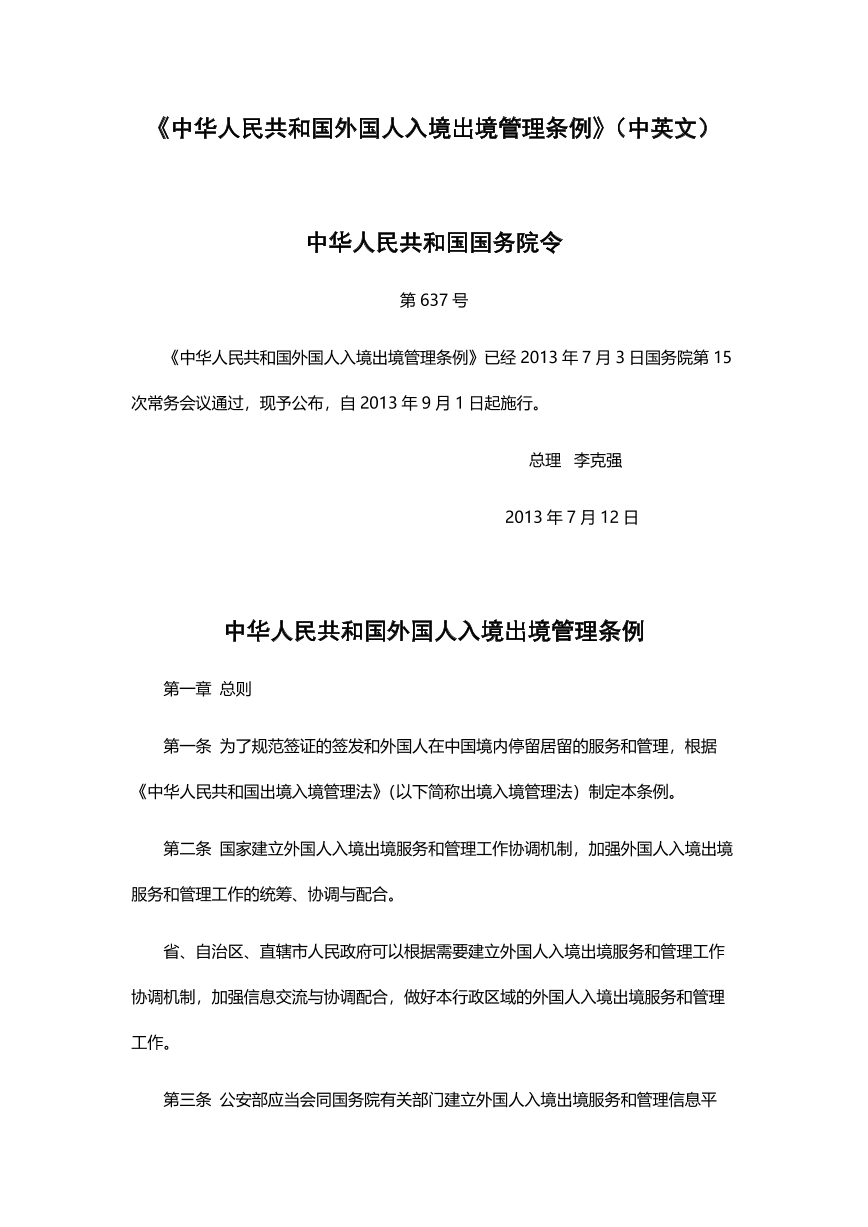 中华人民共和国外国人入境出境管理条例(中英文)